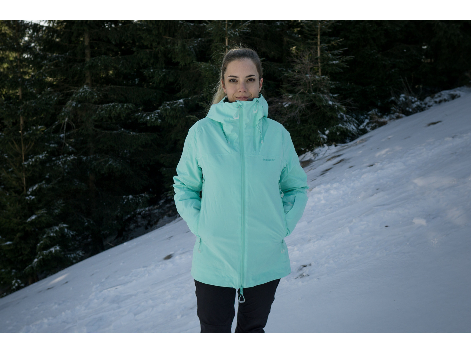 A women’s winter jacket which is windproof and has good resistance against the wet snow and rain. The jacket is made from 100%